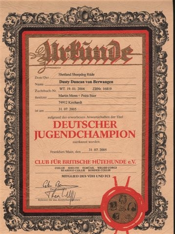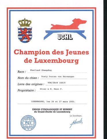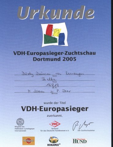 Ausstellungsergebnisse von Lux., Dt. JCh., CACIB Sieger & EUROPASIEGER 2005 Dusty Duncan von Berwangen |