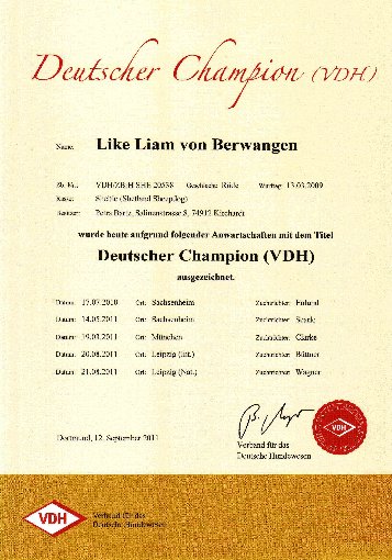 | 20.08.2011 | Int. Leipzig | Offene Klasse | Hr. K. Büttner, D | V1, CAC, CACIB | 851 |