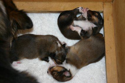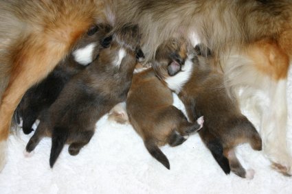 Zum Ende der zweiten Lebenswoche öffnen sich die Augen der Welpen. In der zweiten Lebenswoche beschränken sich die Aktivitäten auf Trinken und Schlafen