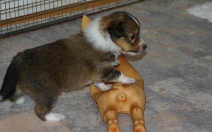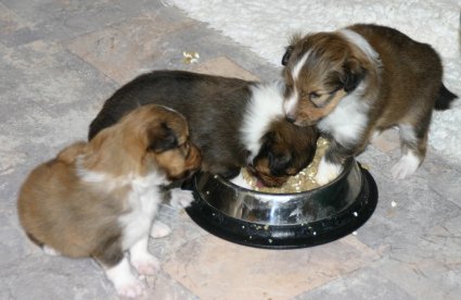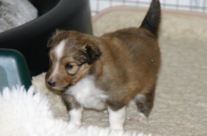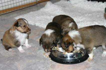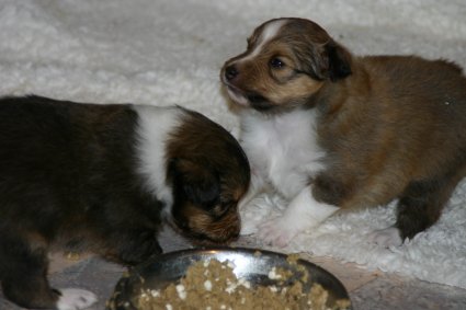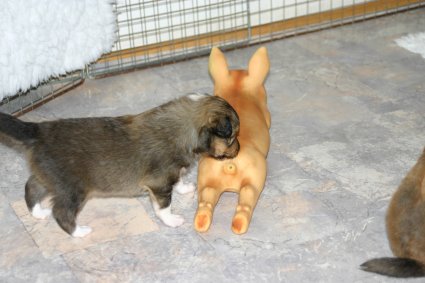 Unsere Welpen sind jetzt 3 Wochen alt, sie laufen schon eifrig, allerdings noch etwas holprig, im ganzen Zimmer umher. Ihre Hauptnahrung ist aber immer noch die Muttermilch. Erst jetzt beginnt der Welpe, seine Umgebung mit allen Sinnen wahrzunehmen. Die Augen sind nun geöffnet, der Welpe nimmt jetzt auch akustische Reize wahr. Der "aufrechte Gang" wird geübt, ebenfalls die Lautäußerungen bis hin zum Bellen und sie haben bereits Ihre Namen! |