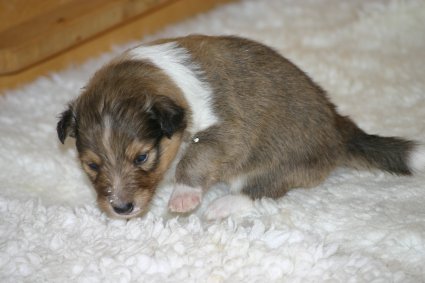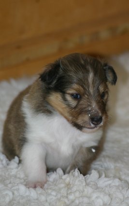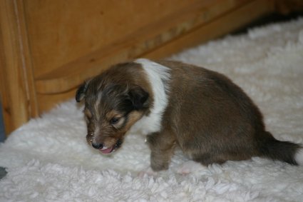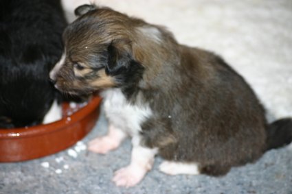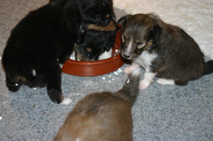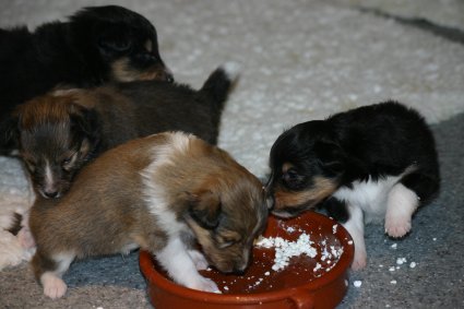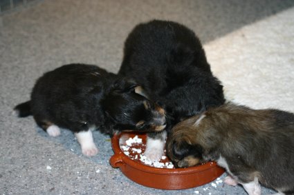 Unsere Welpen sind jetzt 3 Wochen alt, sie laufen schon eifrig, allerdings noch etwas holprig, im ganzen Zimmer umher. Ihre Hauptnahrung ist aber immer noch die Muttermilch. Erst jetzt beginnt der Welpe, seine Umgebung mit allen Sinnen wahrzunehmen. Die Augen sind nun geöffnet, der Welpe nimmt jetzt auch akustische Reize wahr. Der "aufrechte Gang" wird geübt, ebenfalls die Lautäußerungen bis hin zum Bellen und sie haben bereits Ihre Namen! |